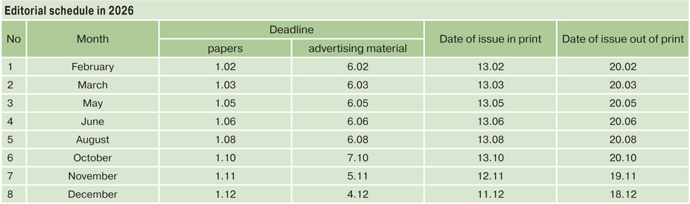 - Articles of postgraduates, whose participation in the article is 100% (the article is written without co-authors), are published free of charge. Postgraduates, who published an article in the journal, will receive by e-mail the article, the contents of the issue and the first page of the cover of the issue in pdf-format.
